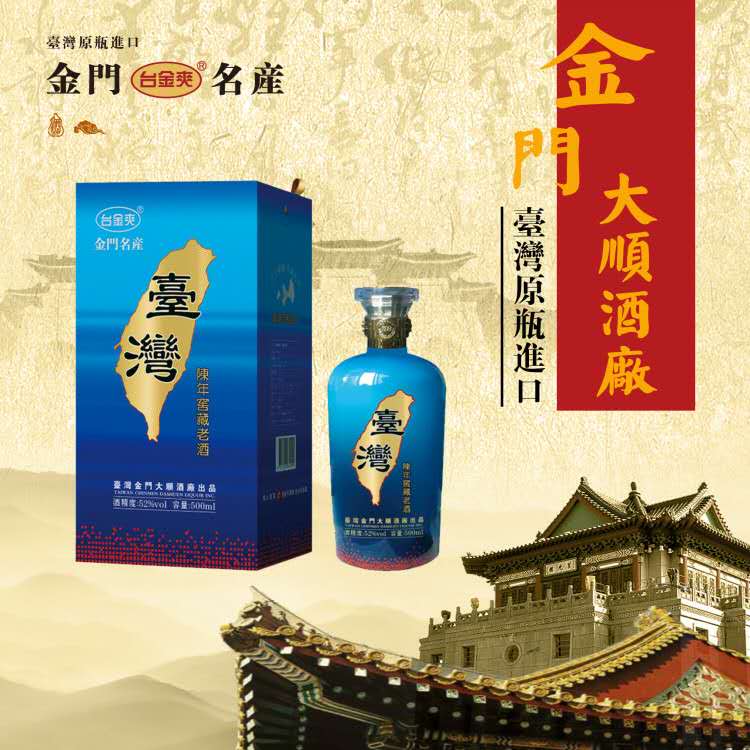金門大順酒廠,座落于金門北緯24.5度,地處海隅,濱大陸,得天獨(dú)厚的地理,使它擁有絕佳的水質(zhì)、空氣、氣候及原料的四大天然釀酒條件。金門大順酒廠的高粱酒釀造是利用金門特產(chǎn)『旱地高粱』、引用當(dāng)?shù)厮|(zhì)甘甜的泉水、金門潔凈的空氣與氣候條件,并承襲傳統(tǒng)古法之釀酒技術(shù),加上獨(dú)家的釀酒專業(yè)技術(shù)經(jīng)驗(yàn)【三離二鍋一翻】的發(fā)酵釀酒工藝,經(jīng)掐頭去尾后入庫,去蕪存菁。而造就出金門大順酒廠的高粱酒特色「清澈透明、質(zhì)地純凈、芳香濃郁」之一系列高粱酒。金門大順酒廠制酒承襲著金門得天獨(dú)厚的地理環(huán)境,加上三代流傳之古法醇釀技技術(shù),結(jié)合經(jīng)驗(yàn)與現(xiàn)代化生產(chǎn),釀出風(fēng)味獨(dú)特,香、醇、甘、冽的【臺島】【臺金爽】【牛樟芝高粱酒】【龍騰鳳舞】【紅雙十】【陳高吶】【臺灣小酒】等多樣系列產(chǎn)品。真實(shí)原味、清香散發(fā),甘冽醇厚的絕佳風(fēng)味。